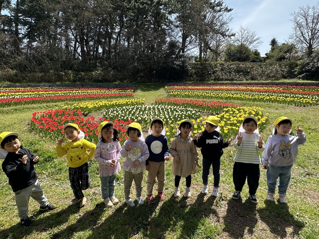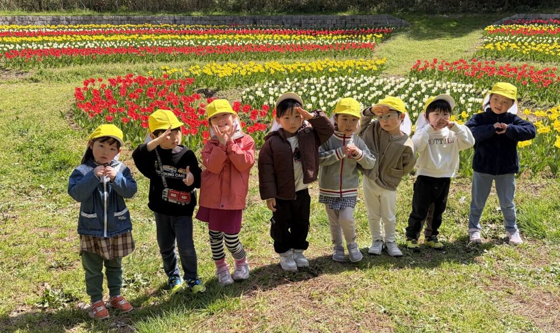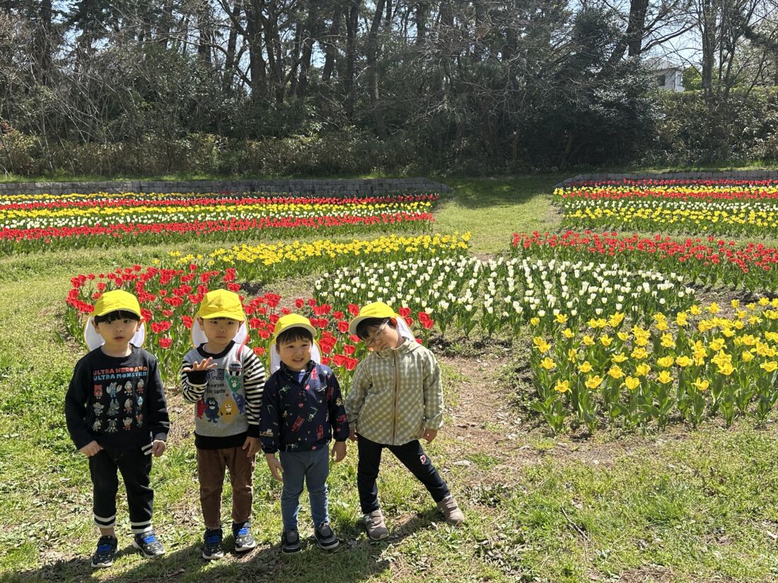 歩きながらチューリップやちょうちょを見て喜んでいました。飛行機が飛んでいて、「飛行機だよ!」「どこに行くのかな?」と大喜びしていました。